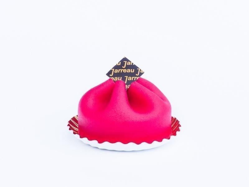 Vanillecake gevuld met frambozen crème en frambozen bessen jam en met marsepein bekleed.