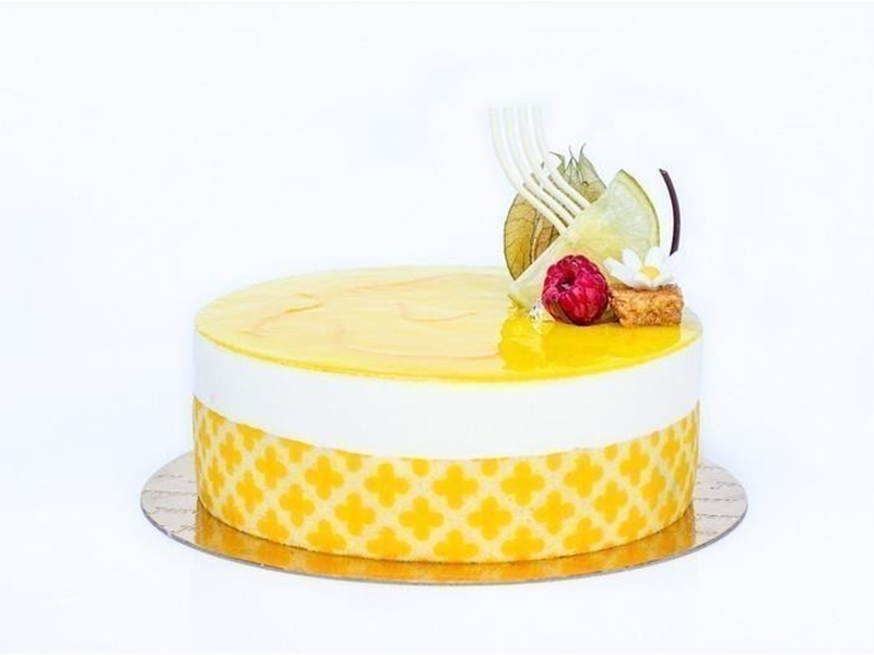 Harde wener bodem met een”zachte” citroenbavarois met een spiegel van citroen gelei.