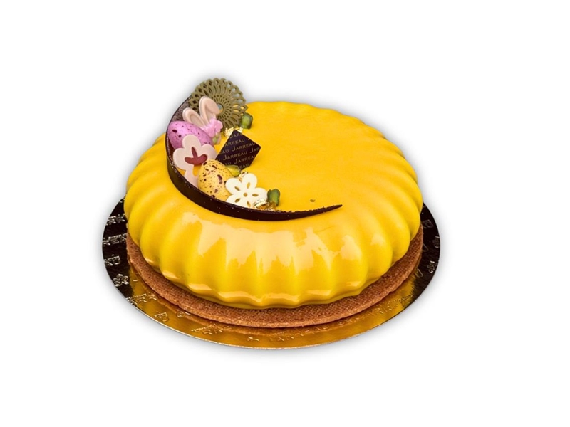 Tropisch fruit mousse, praliné-banaan financier, bananen compote, chocolade-amandel biscuit, mango-kalamansi crémeux en een citrus crumble.